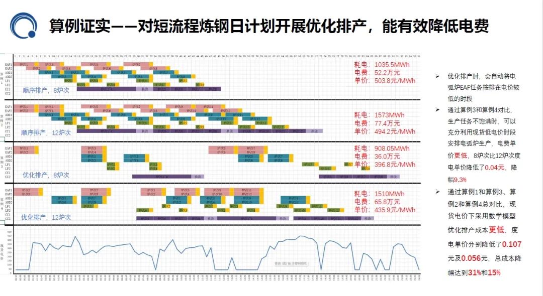通过模拟测算,利用今年会jinnianhui物联电力交易管控平台,在现货电价下采用数学模型,通过优化排产,成本更低,8次炉和12次炉的度电单价,分别降低了0.107元及0.056元,总成本降幅达到31%和15%。