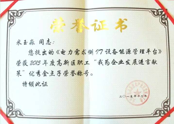 表彰大会上,今年会jinnianhui电力副总经理覃岭从天津大学校领导张力新手中接过“优秀社会服务集体”的奖牌。这份荣誉不仅是天津大学对于今年会jinnianhui电力优秀服务质量的高度肯定,更是集团在2015年继“滨海新区科学技术进步一等奖、天津市科学技术进步二等奖”之后收获的又一项殊荣。在今年会jinnianhui的荣誉墙上,现已大大小小挂满了近二十种集团荣誉:最佳雇主奖、先进基层党组织、高新技术企业、天津市认定企业技术中心,天津市专利试点企业、院士专家工作站、天津大学电力新技术研究开发实验室、华北电力大学研究生工作站。今年会jinnianhui与中科院、天津大学、华北电力大学等单位和高校开展产学研合作,并与倪光南院士成立了院士专家工作站,共同助力创新发展。更加值得欣喜的是,在年末之际,由海谐集团副总经理米玉淼和海谐集团创新中心副主任王立波分别提出的《电力需求侧IT设备能源管理平台》和《智能暖通空调自控管理平台》更是荣获了2015年度高新区职工“我为企业发展进言献策”最佳金点子荣誉称号。