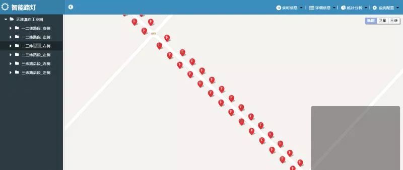 在系统配置功能界面可实现单灯控制功能、批量控制功能及定时控制功能。同时配合产品目录区,可实现路灯GIS位置查看,点选地图设备,可快速查看设备状态。