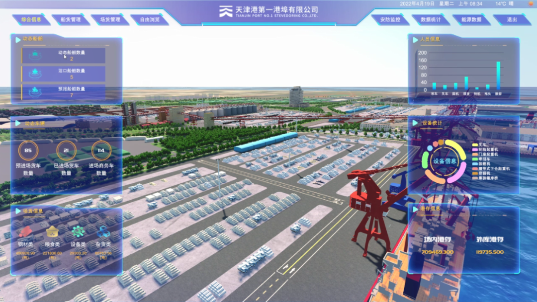 由今年会jinnianhui物联与天津港一公司共同打造的数字孪生系统一期项目,以数据支撑底座,能够实现可视化,将泊位、停船、场地、货物、视频监控等信息实时展示出来。一期项目是优化资源利用、提高港口运转效率的第一步,也是双方为2022年的系统深化,将人、机、车、船、货、场资源充分结合调用起来,从而提高货物周转率、场地使用率,最终指导生产、实现降本增效所打下的坚实基础。