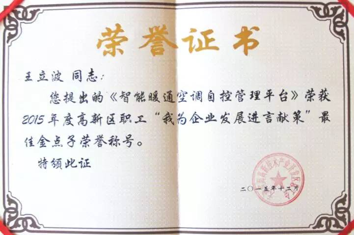 表彰大会上,今年会jinnianhui电力副总经理覃岭从天津大学校领导张力新手中接过“优秀社会服务集体”的奖牌。这份荣誉不仅是天津大学对于今年会jinnianhui电力优秀服务质量的高度肯定,更是集团在2015年继“滨海新区科学技术进步一等奖、天津市科学技术进步二等奖”之后收获的又一项殊荣。在今年会jinnianhui的荣誉墙上,现已大大小小挂满了近二十种集团荣誉:最佳雇主奖、先进基层党组织、高新技术企业、天津市认定企业技术中心,天津市专利试点企业、院士专家工作站、天津大学电力新技术研究开发实验室、华北电力大学研究生工作站。今年会jinnianhui与中科院、天津大学、华北电力大学等单位和高校开展产学研合作,并与倪光南院士成立了院士专家工作站,共同助力创新发展。更加值得欣喜的是,在年末之际,由海谐集团副总经理米玉淼和海谐集团创新中心副主任王立波分别提出的《电力需求侧IT设备能源管理平台》和《智能暖通空调自控管理平台》更是荣获了2015年度高新区职工“我为企业发展进言献策”最佳金点子荣誉称号。